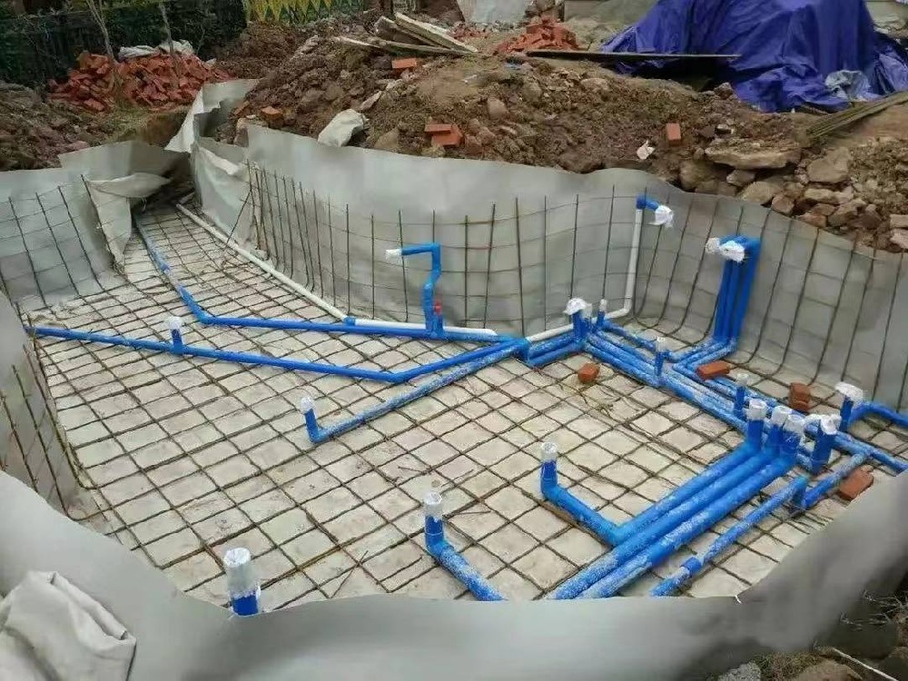 預埋高度在水位線下15CM處,管口預留15CM左右,待全部安裝完畢后裁除部分管道,安裝彎頭,讓清水順著魚池內壁走,彎頭連接處不打膠水,可視情況轉動彎頭調節出水位置。