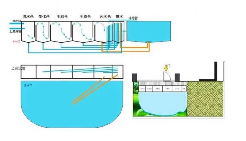 目前市面上常用的魚池過(guò)濾系統(tǒng)有兩種,一種是傳統(tǒng)的過(guò)濾池,即利用溢流過(guò)濾的原理在在魚池旁邊建多個(gè)并排倉(cāng)室的設(shè)計(jì)方式,池水流過(guò)每個(gè)過(guò)濾單元里有大量孔隙的濾材,通過(guò)濾材吸附和阻隔將雜物攔截,利用雜物自重,沉降在每個(gè)過(guò)濾倉(cāng)底部,在生化倉(cāng)把硝酸鹽、氨、氮等物質(zhì)降解,實(shí)現(xiàn)凈化水質(zhì)目的。后用水泵將清水倉(cāng)的水抽回魚池,實(shí)現(xiàn)魚池水循環(huán)凈化。